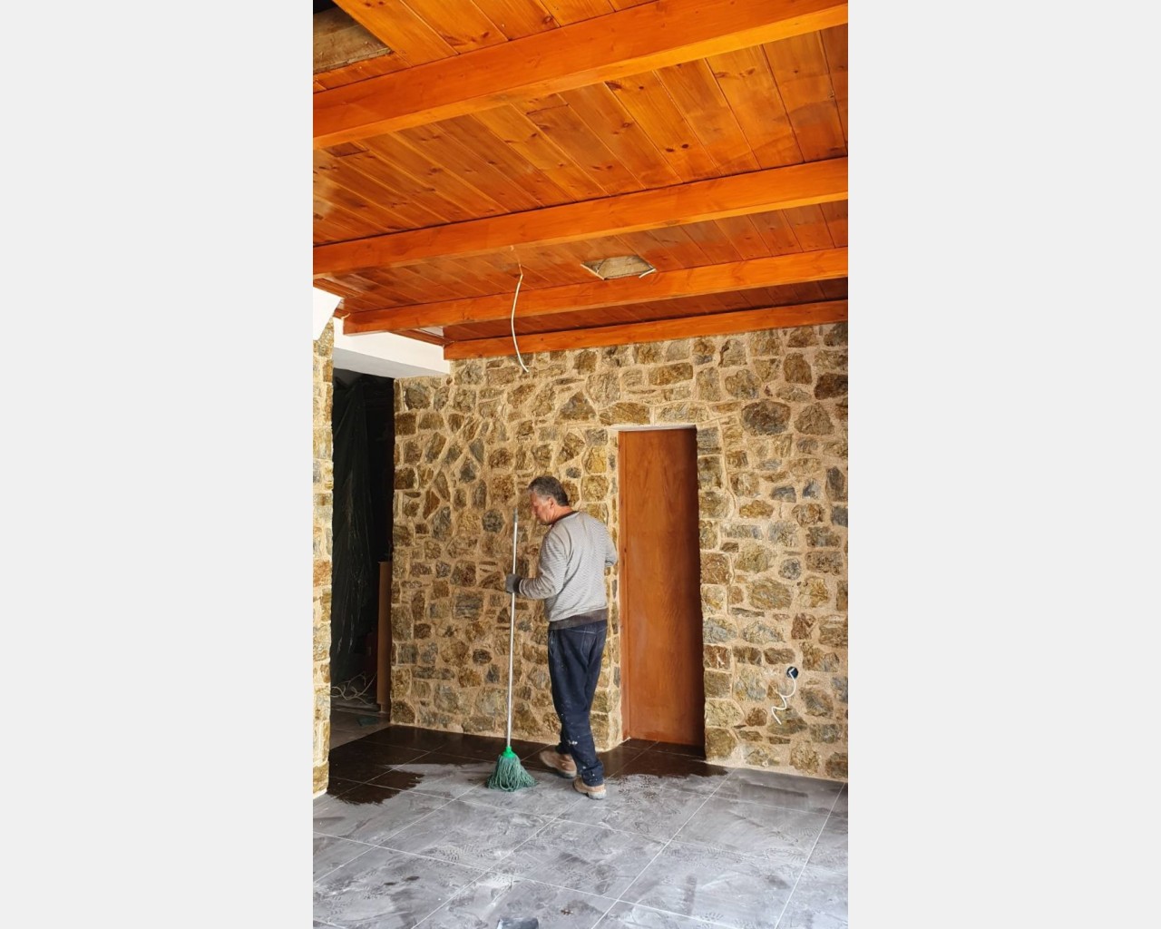 Πραγματοποιήθηκε επέκταση του χώρου με το άνοιγμα της όψης και τοποθέτηση υαλοστασίου για διαπερατότητα και σύνδεση με τον εξωτερικό χώρο. Επιπλέον επένδυση τοιχοποιίας με πέτρα και διαμόρφωση δαπέδων και οροφής με ξύλινα δοκάρια για παραδοσιακή ατμόσφαιρα.